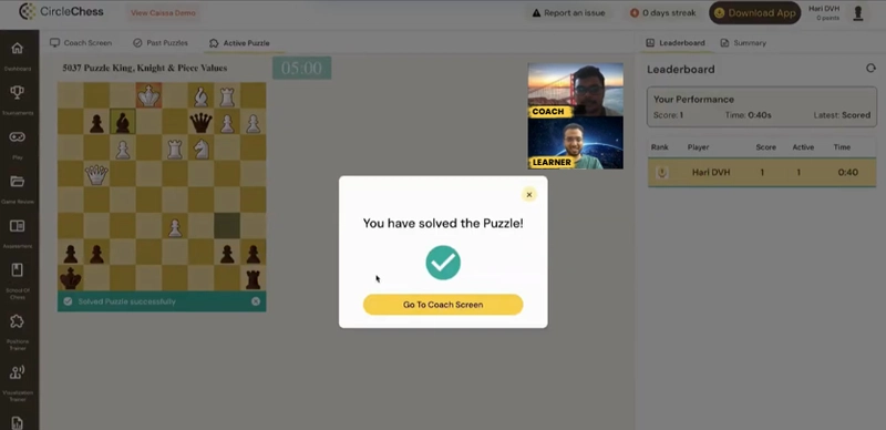 During class, the coach can also share a chess position on screen and instantly transform it into an interactive puzzle for students to solve, providing real-time guidance and feedback and all this with a click of a button! This dynamic approach turns the classroom into an environment where children actively engage, experiment, and grow -removing the fear of mistakes while encouraging risk-taking, creativity, and confident decision-making.